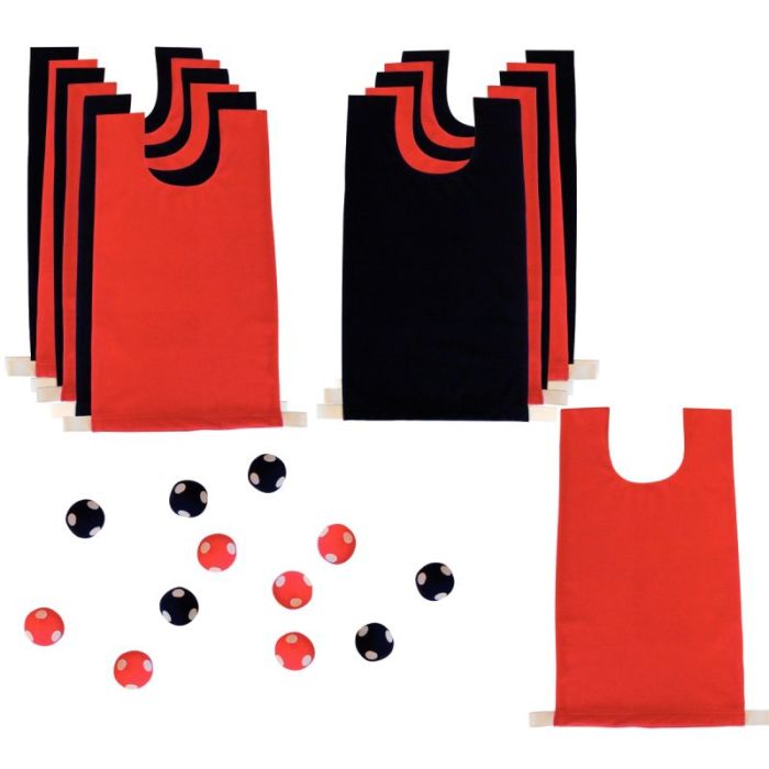12 chasubles (6 rouges et 6 bleues) accrocheuses et 12 balles (6 rouges et 6 bleues) scratch