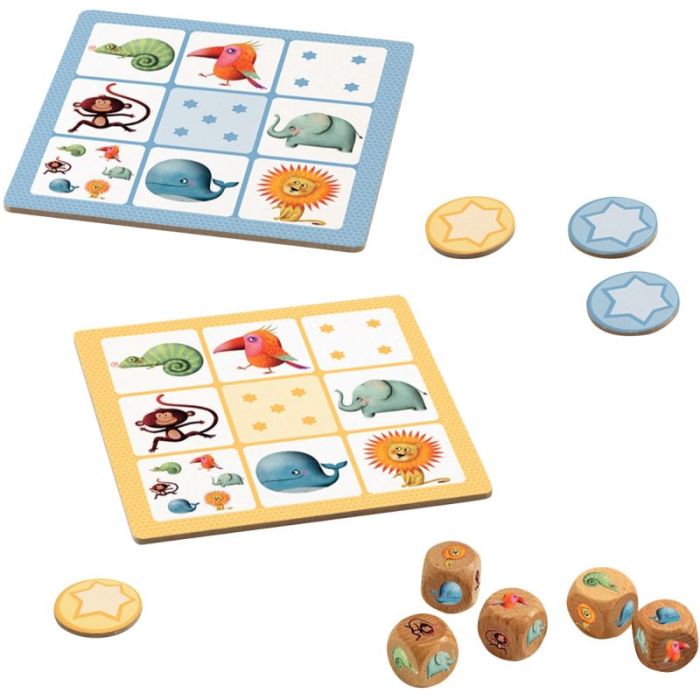 But du jeu : L’enfant qui remplit une ligne avec 3 jetons ou fait un Yam’s (5 animaux identiques) gagne la partie