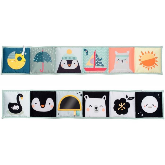 Livre d’activités accordéon ou tour de lit en tissu doux avec un côté coloré et un côté en noir et blanc