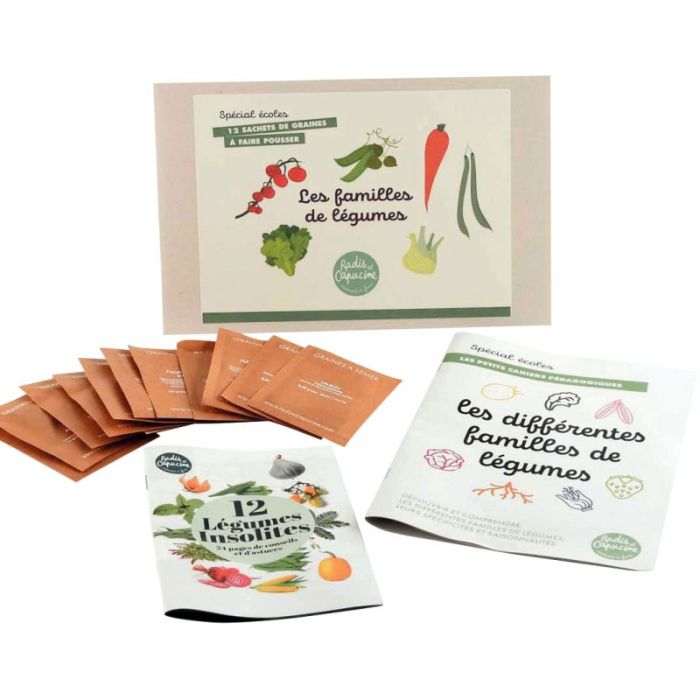 Contenu : 12 sachets de graines : carotte nantaise bio, haricot nain à cosse verte bio, laitue à couper bio, fenouil, tomate cerise bio, haricot magique, 1 livret pédagogique sur les légumes destiné à l’enseignant