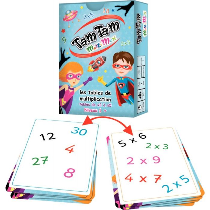 Contenu : 42 cartes (7x10cm), 10 cartes tables de multiplication, 1 guide trucs et astuces de mémorisation, 1 règle des différents jeux