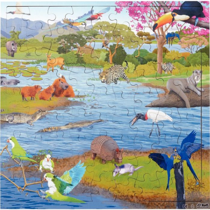 Puzzle de 81 pièces en bois verni de très belle qualité riche en couleurs présenté dans un plateau de rangement en bois