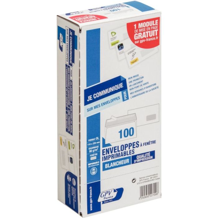 Boite de 100 enveloppes blanches 110x220mm 80g bande siliconée fenêtre 45x100mm