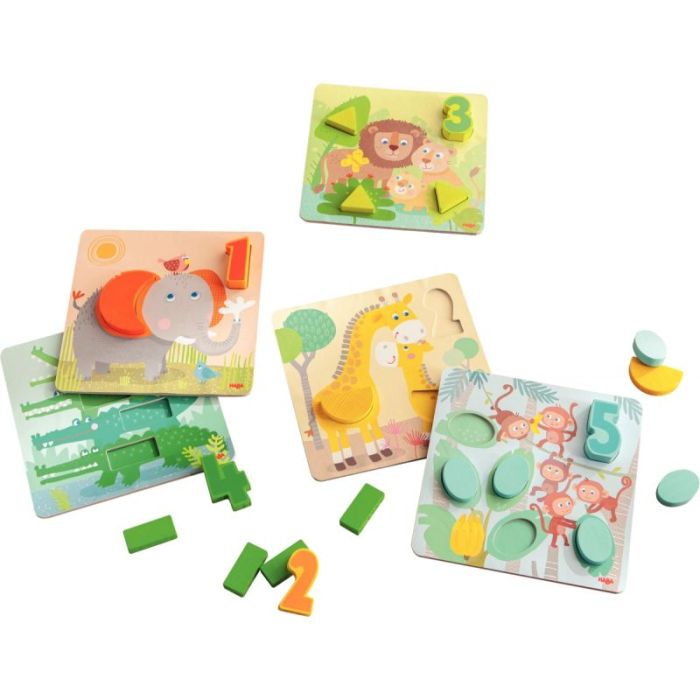 20 pièces en bois de hêtre certifié PEFC à encastrer sur 5 plateaux de jeu en carton épais représentant les animaux de la savane : 1 éléphant, 2 girafes, 3 lions, 4 crocodiles et 5 singes