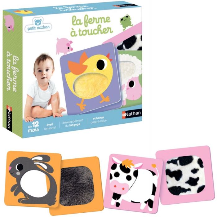 Un jeu qui propose des expériences multisensorielles à bébé : toucher, caresser, manipuler, à la découverte des animaux de la ferme