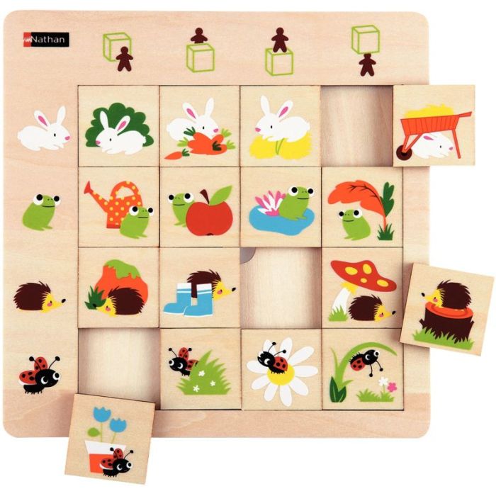 Puzzle conçu sur le principe du tableau à double entrée pour aborder de façon ludique les premières notions de repérage spatial : devant/derrière, dessus/dessous.