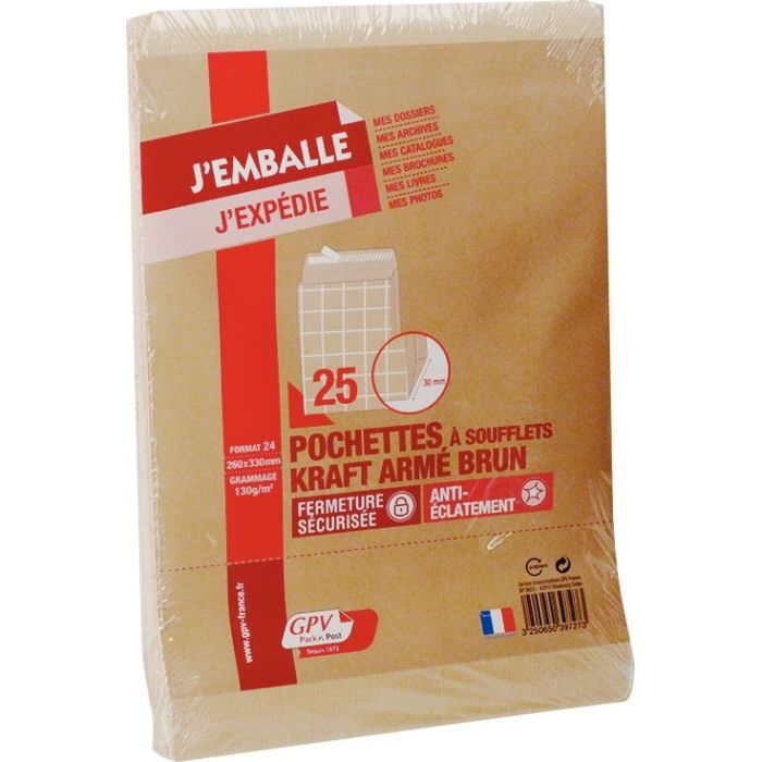 Paquet de 25 pochettes kraft armé 260x330mm soufflet 30mm bande siliconée