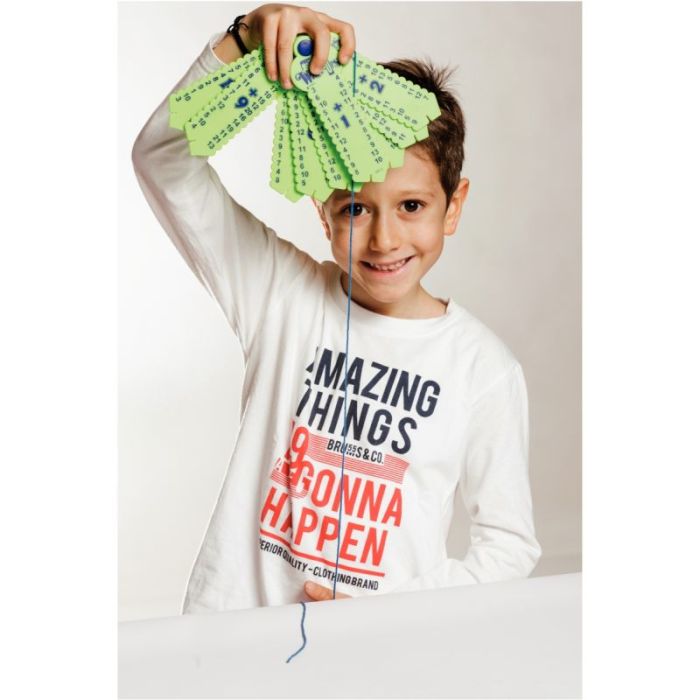 A l’aide du lacet, l’enfant doit associer la réponse (sur la droite) à l’opération demandée (sur la gauche)