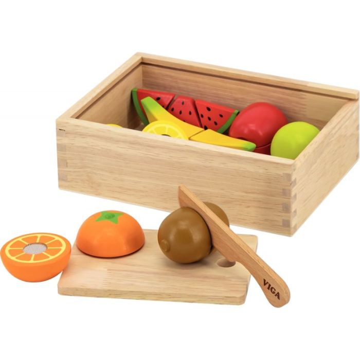 17 pièces en bois : 1 planche à découper, 1 couteau et 7 fruits à scratch qui se coupent en 2 (en 3 pour la pastèque) et se reconstituent facilement