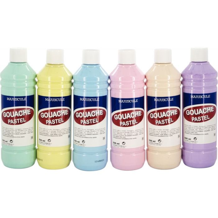 Carton de 6 Flacons 500ml de gouache pastel + 10 brosses plates synthétiques n°12