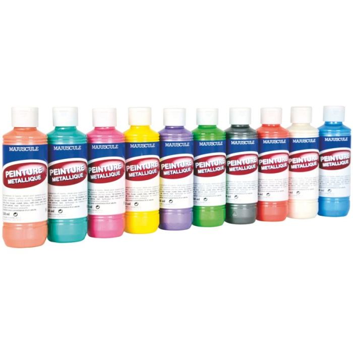 Boîte de 10 flacons de 250 ml de peinture acrylique métallique. 10 assortis : blanc, jaune, vermillon, rose, violet, bleu, vert clair, vert foncé, terre de sienne, noir