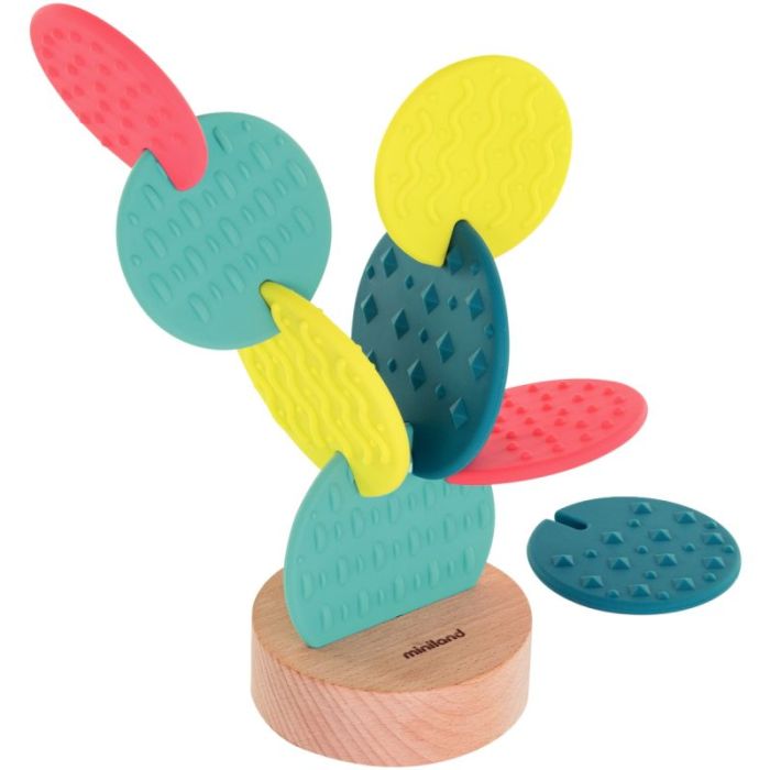 Jeu sensoriel en forme de cactus composé de 8 disques en silicone souple avec différentes textures et couleurs à assembler sur une base ronde en bois