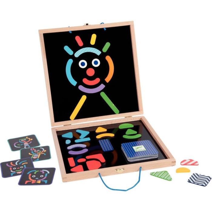 Contenu du Jeu : Livré dans un coffret en bois avec fermeture 30 x 30 cm magnétique des 2 faces, 35 formes magnétiques coloris assortis divers et 20 cartes plasifiées avec des figures à reprodruire