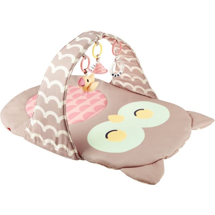 Tapis en tissu doux et rembourré en forme de chouette avec 3 jouets d'activités suspendus à une arche (jouets non amovibles) : un hochet à billes, un oiseau chanteur et un miroir