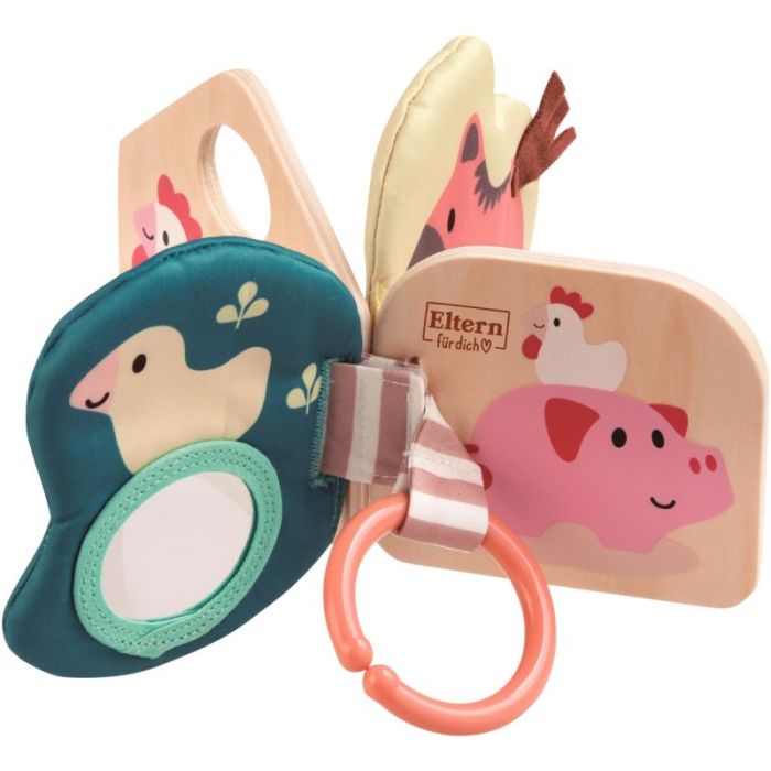 Petit livre de 4 pages détachables liées entre elles par un velcro® : 2 pages en bois et 2 pages en tissu rembourré