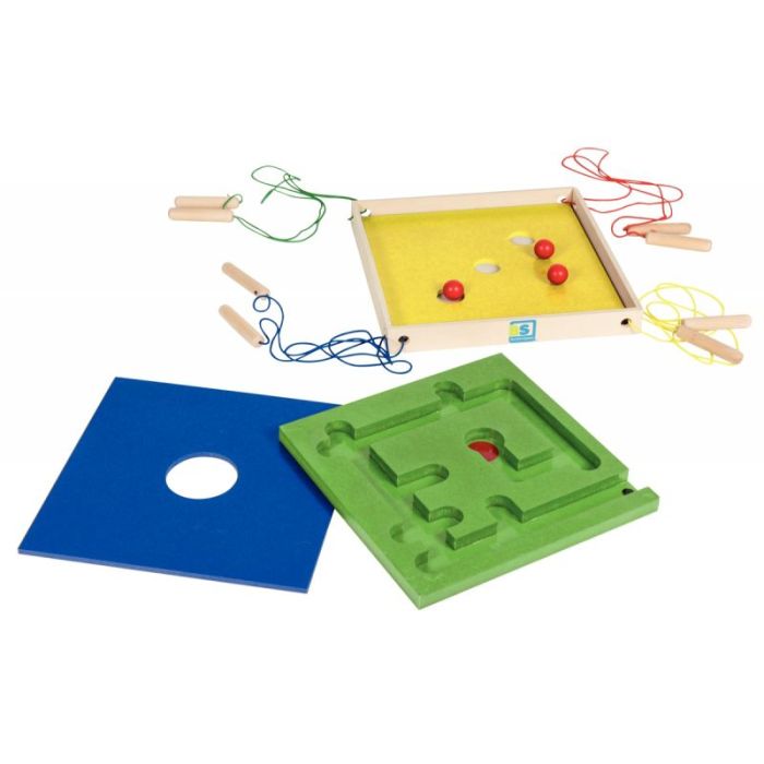 Contenu : Une base en bois relié à 4 cordes, trois plateaux de jeux différents, 3 boules d