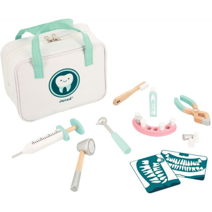 Mallette en tissu zippée avec 2 poignées de transport et 9 accessoires en bois certifié FSC : un dentier avec 8 dents amovibles (6 blanches et 2 grises), une brosse à dents (L.12 cm), du dentifrice, une seringue pour l'anesthésie, une pince (L.12 x l.4 x ép.1,2 cm), un miroir et une fraise dentaires, et 2 radiographies de la mâchoire (carton épais).