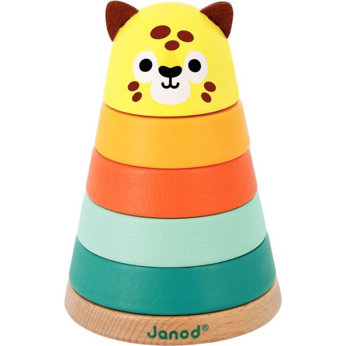 Pour reconstituer le jaguar, l'enfant doit empiler 5 pièces de tailles croissantes sur un socle en suivant les couleurs représentées sur la tige