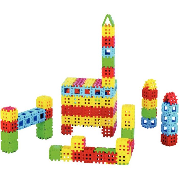 Contenu : 170 grandes pièces carrées pleines, perforées ou creuses et de 4 couleurs assorties (bleu, rouge, vert et jaune) livrées dans un grand coffre de rangement en carton très pratique avec couvercle amovible et poignées